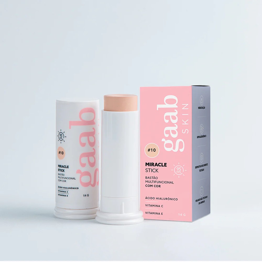 O mundo da beleza está apostando em produtos em bastão, inclusive quando o assunto é pele. O lançamento da vez nessa área é o bastão multifuncional da marca Gaab - de Gabriela Pugliesi - que é base e protetor solar ao mesmo tempo. Com FPS 95, a fórmula traz ácido hialurônico, Vitamina C e Vitamina E e está disponível em 6 cores, do #10 [o mais claro], até o #60 [o mais escuro]. O produto é resistente à água e tem toque seco.